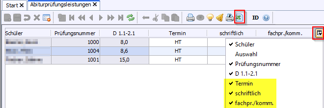 Kursstufe > Abiturprüfungsleistungen: Blenden Sie über das Symbol am rechten Spaltenkopfende die jeweils nicht benötigten Spalten aus.